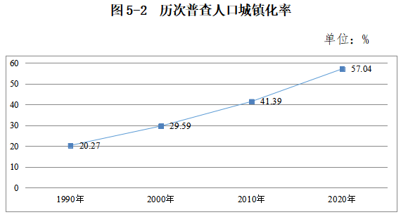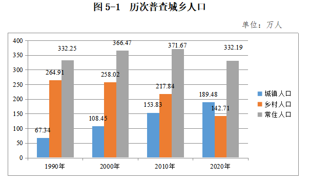 全市常住人口中,居住在城镇的人口为1894757人,占57.04%;居住在乡村的人口为1427096人,占42.96%。与2010年第六次全国人口普查相比,城镇人口增加356402人;乡村人口减少751280人,城镇人口比重增加15.65个百分点。