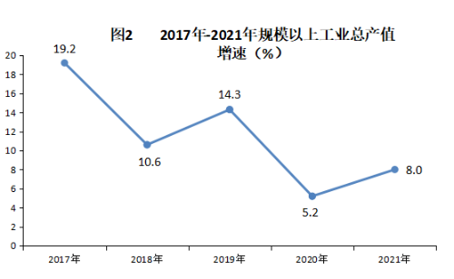 全年规模以上工业总产值322.67亿元,同比增长8.0%。按轻重工业分,轻工业产值124.70亿元,增长6.0 %;重工业产值197.97亿元,增长9.4%。规模以上工业增加值122.24亿元,同比增长4.8%。工业企业产销衔接状况良好,全年规模以上工业企业营业收入284.59亿元,比上年增长12.5%,产销率89.26%,实现利润19.69亿元,同比下降11.76%。