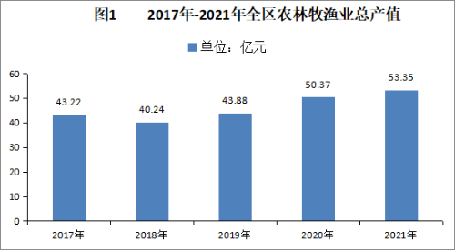 全年农林牧渔及农林牧渔服务业完成总产值 53.35 亿元,比上年增长7.2%。其中,农业产值37.56亿元,增长9.0%;林业产值0.58亿元,增长25.9%;畜牧业产值13.49亿元,增长3.2%;渔业产值411万元,下降21.3%。