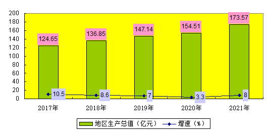 据初步核算,全年实现地区生产总值173.57亿元,比上年增长8.0%。其中,第一产业完成增加值26.49亿元,比上年增长6.5%;第二产业完成增加值86.57亿元,比上年增长7.8%;第三产业完成增加值60.51亿元,比上年增长8.9%。