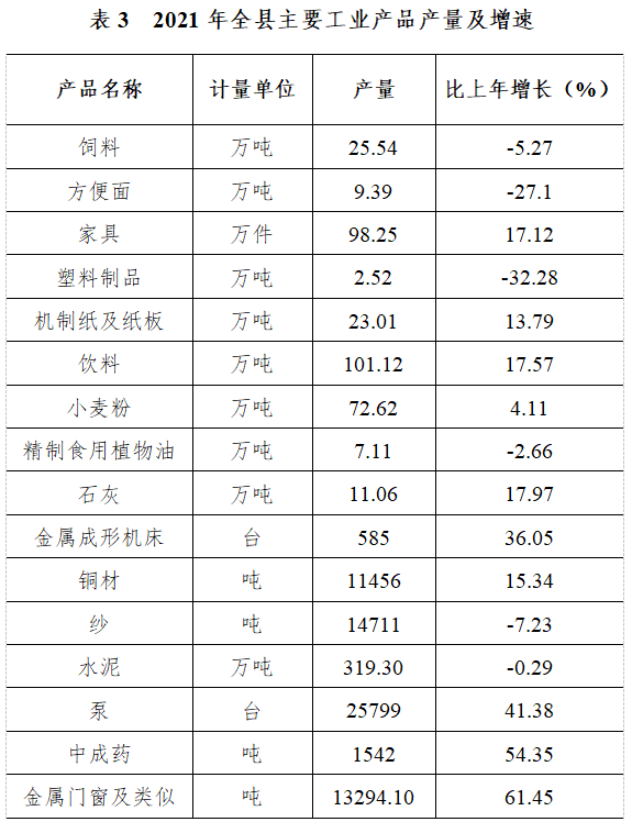 全年全部工业增加值比上年增长10%,占生产总值的比重达到37.5%。其中,全县88户规模以上工业企业(年主营业务收入2000万元及以上的工业法人企业)工业总产值比上年增长10.75%;实现工业增加值比上年增长9%。