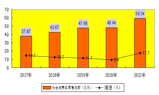 全年社会消费品零售总额59.34亿元,比上年增长17.7%。按消费区域分,城镇消费品零售额53.07亿元,同比增长22.2%,占全社会消费品零售总额的89.4%;农村市场实现消费品零售额6.27亿元,同比下降10.2%,占全社会消费品零售总额的10.6%。按消费形态分,餐饮收入5.02亿元,同比下降6.6%;商品零售54.32亿元,同比增长20.6%。