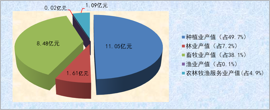2021年全县农林牧渔业总产值实现22.25亿元,同比增长7.4%。其中,种植业产值实现11.05亿元,同比增长9.6%;畜牧业产值实现8.48亿元,同比增长7.7%;林业产值实现1.61亿元,同比增长-0.5%;渔业产值实现0.02亿元,与上年持平;农林牧渔服务业产值实现1.09亿元,同比增长3.7%。(2021年全县农林牧渔业及服务业产值比重见图五)