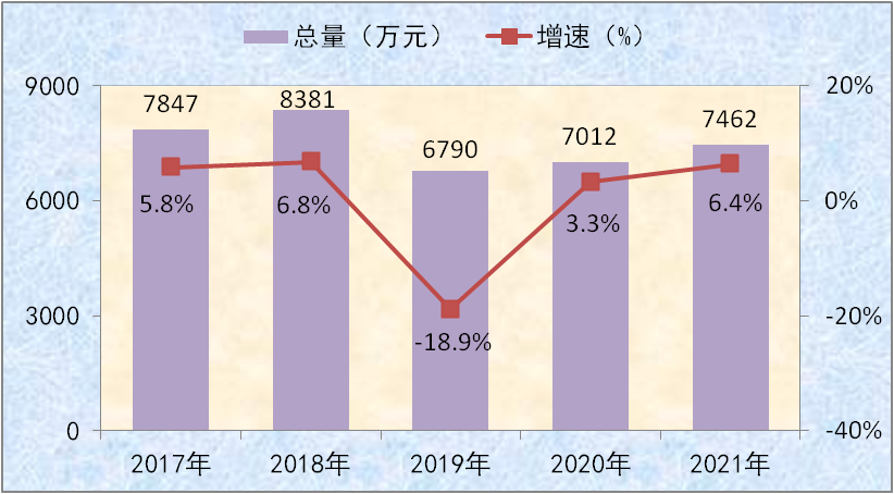2021年地方财政收入7462万元,同比增长6.4%,其中各项税收收入4987万元,同比增长7.3%,非税收入2475万元,同比增长4.7%。全年财政支出124965万元,同比增长-15.9%,其中一般公共服务支出14661万元,同比增长-14.1%,教育支出23210万元,同比增长4.2%,社会保障和就业支出14646万元,同比增长-15.3%,卫生与健康支出9032万元,同比增长-15.4%,节能环保支出5182万元,同比增长-3.2%,城乡社区事务支出3046万元,同比增长12.8%,农林水事务支出34955万元,同比增长-14.8%。(2017-2021年全县地方财政收入及增速见图三)