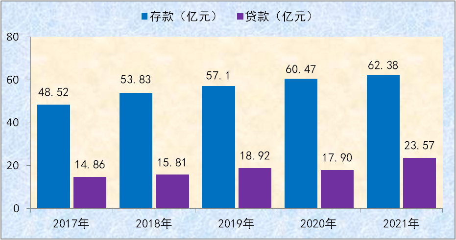 2021年全县金融机构各项存款余额达到62.38亿元,比年初增长3.2%,其中住户存款50.64亿元,比年初增长8.6%。各项贷款余额23.57亿元,比年初增长31.7%。(2017-2021年全县金融机构存贷款余额详见图十二)