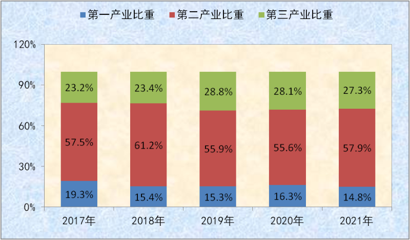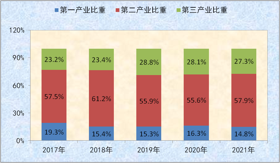 图二:2017-2021年全县三次产业占生产总值比重