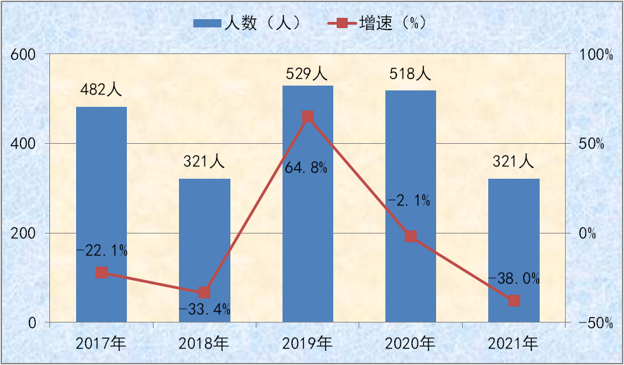 2021年全县初中毕业生1091人,比上年下降2.3%。高中毕业生737人,比上年下降7.3%,其中千阳中学文史理工类考生共计569人,文史理工类本科上线321人,本科上线率56.4%,理工类最高分626分,本科上线率58.3%,文史类最高分622分,本科上线率51%。县职业中专参加高考单招考试学生366人,本科上线人数79人,最高分409分(满分450分),位居全市第1位,全省第2位。(2017-2021年全县本科上线人数及增速详见图十一)