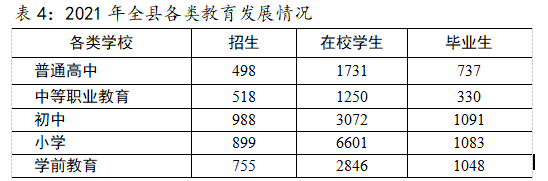 2021年全县各类学校共计33所,在校学生15500人,其中普通高中1所,在校学生1731人,比上年下降12.4%;职业中专1所,在校学生1250人,比上年增长11.1%;初级中学4所,在校学生3072人,比上年下降2.8%;小学12所,在校学生6601人,比上年下降3.7%;全县幼儿园15所,在园人数2846人,其中普惠性民办幼儿园5所,在园人数862人。(2021年全县各类教育发展情况详见表4)