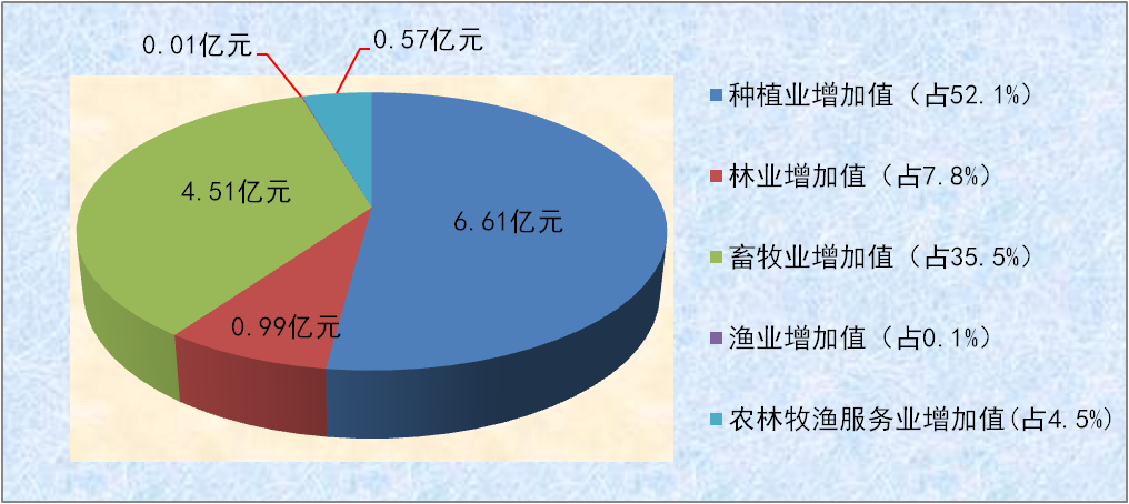 2021年全县农林牧渔业增加值实现12.69亿元,同比增长6.8%。其中,种植业增加值实现6.61亿元,同比增长6.7%;畜牧业增加值实现4.51亿元,同比增长8.3%;林业增加值实现0.99亿元,同比增长2.3%;渔业增加值实现0.01亿元,同比增长1.1%;农林牧渔服务业增加值实现0.57亿元,同比增长7.5%。(2021年全县农林牧渔业增加值比重见图六)