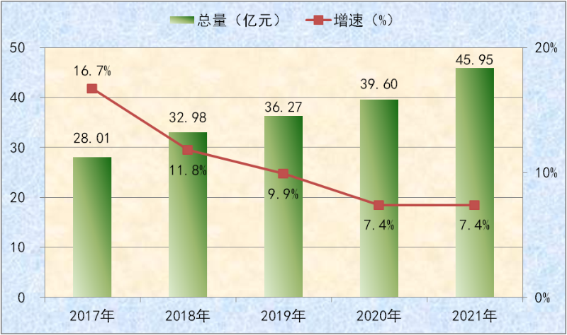 图一:2017-2021年全县生产总值及增速