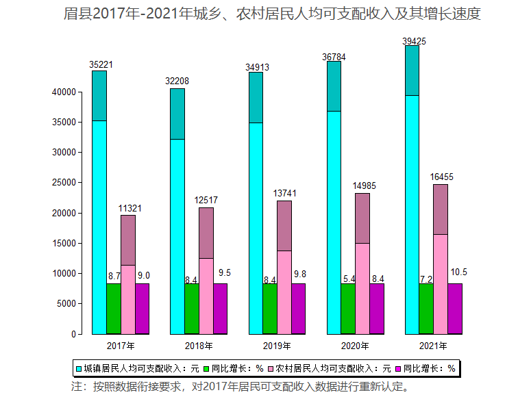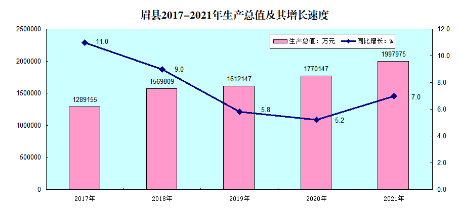 3.公报中主要经济指标为县统计局年报数据,农业生产数据来自县农业农村局;水利建设数据来自县水利局;商贸数据来自县供销联社;科技、外贸数据来自县商务和工信局;运输数据来自县交通运输局;机动车辆、户籍人口数据来自县公安局;邮政数据来自县邮政分公司;移动电话数据来自县电信分公司、移动公司、联通公司,固话数据来自县电信分公司;招商引资数据来自县招商局;项目建设和投资数据来自县发改局;城区建设数据来自县住建局;文化、旅游、文物数据来自县文物和旅游局;财政数据来自县财政局;金融数据来自人民银行眉县支行;商标、专利数据来自县市场监督管理局;教育体育数据来自县教体局;卫生、人口自增率、出生、人口性别比数据来自县卫健局;就业创业、养老、工伤、失业保险数据来自县人社局;医疗保险数据来自县医疗保障局;营商环境数据来自县行政审批局;低保、五保、社会团体数据来自县民政局;两项收入数据来自国家统计局眉县调查队;土地数据来自县自然资源局;林业数据来自县林业局;环境监测数据来自市生态环境保护局眉县分局;安全生产数据来自县应急管理局。