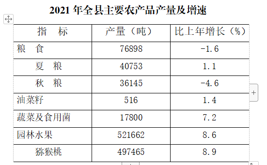 据抽样调查,全年粮食播种面积19.71万亩,比上年增长0.02%;粮食总产量7.69万吨,比上年下降1.6%。蔬菜及食用菌产量1.78万吨,比上年增长7.2%;园林水果产量52.2万吨,比上年增长8.6%;猪牛羊禽肉产量1.02万吨,比上年增长32.7%。