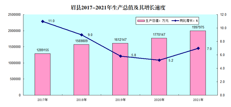 初步核算,2021年全县实现生产总值1997975万元,比上年增长7.0%。其中,第一产业增加值316335万元,增长6.2%;第二产业增加值1069283万元,增长7.5%;第三产业增加值612357万元,增长6.5%。